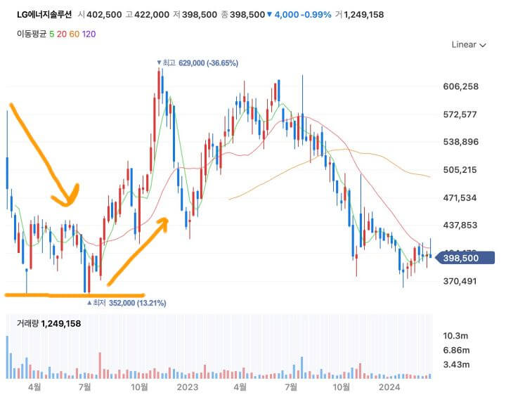LG에너지설루션 주봉 차트입니다. 위의 두산로보틱스와는 다르게 주봉 기준으로 꽤 장기간 상장 첫날 가격보다 아래에 있는 차트 봉을 확인하실 수 있습니다.